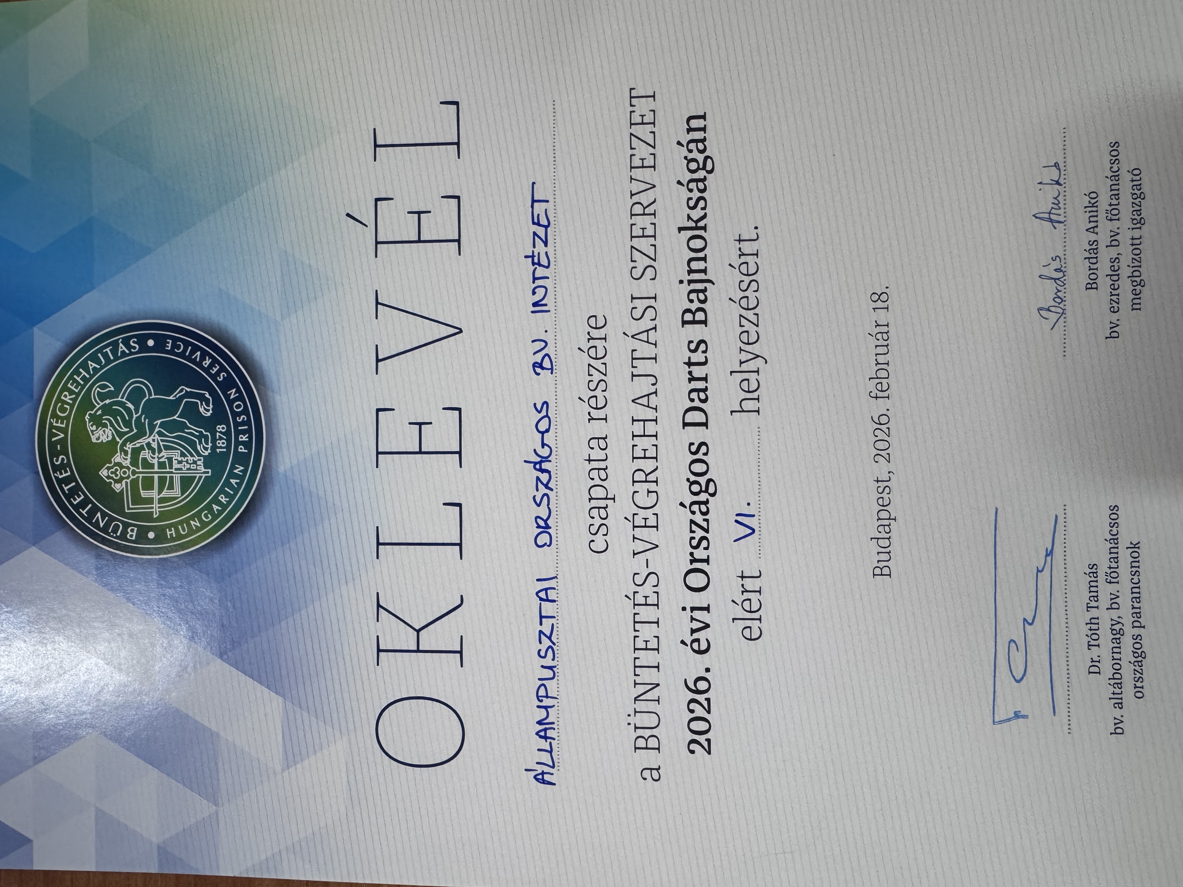 2026. február 18-án, szerdán rendezték meg a Büntetés-végrehajtási Szervezet 2026. évi Országos Pontszerző Bajnokságának nyitó eseményét, a darts versenyt. A rangos megmérettetésnek a budapesti Récsei Center – REMIZ Sport- és Rendezvényterem adott otthont.