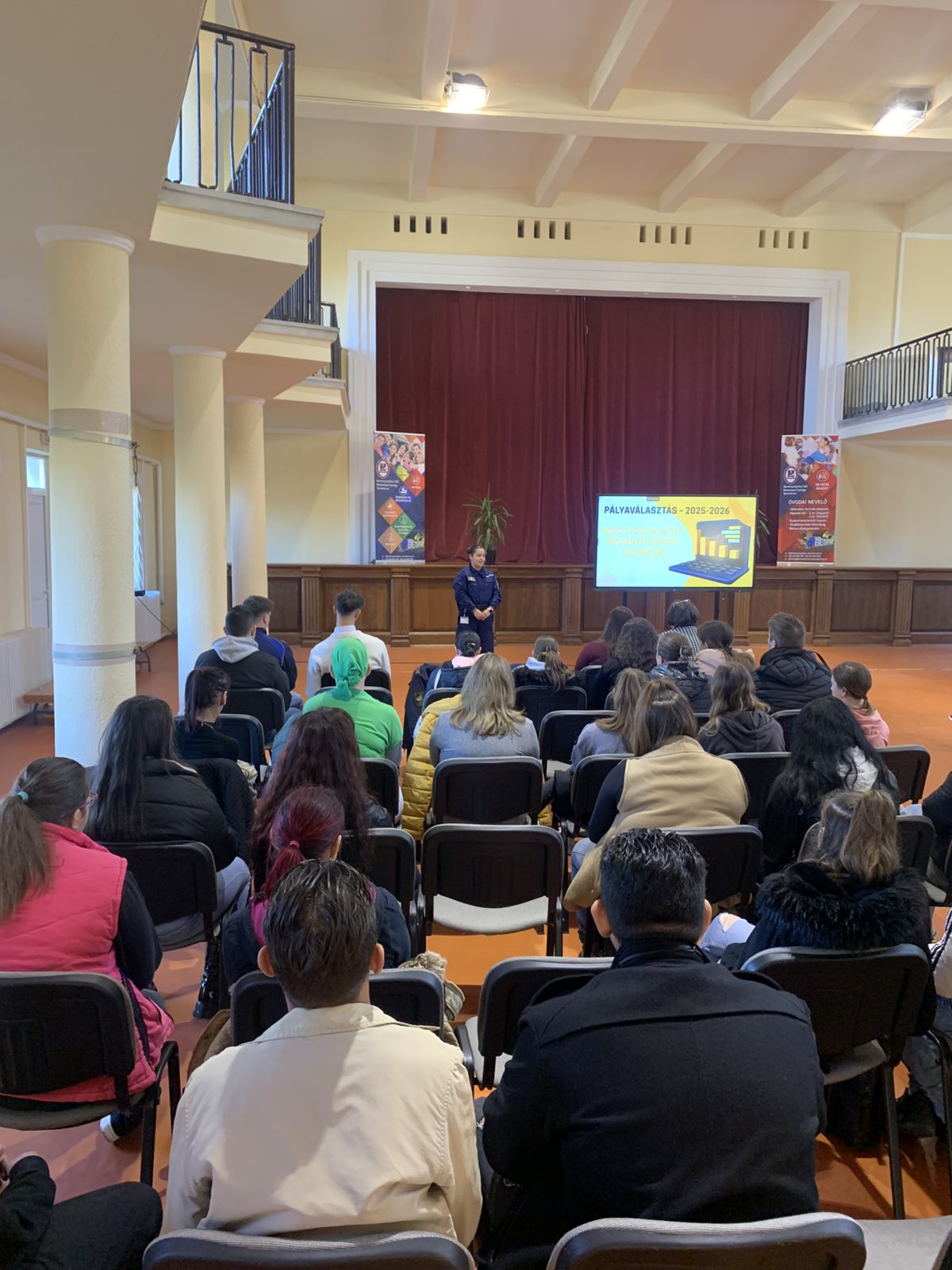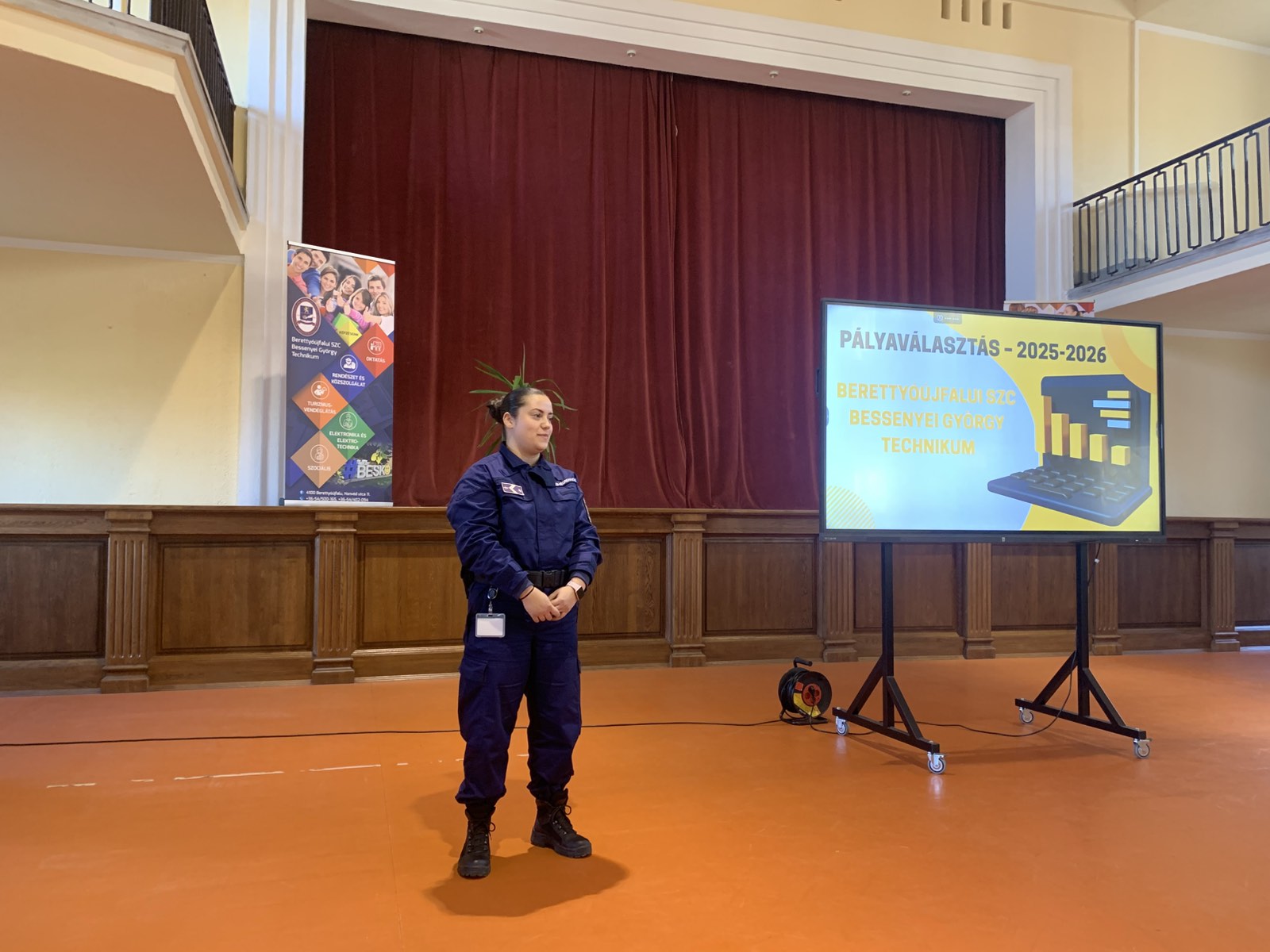 Kolléganőnk a rendezvényen saját életútját ismertette a továbbtanulás előtt álló diákokkal és szüleikkel. Elmesélte, hogy az iskolában szerzett tudást, valamint lehetőségeket kihasználva került be a duális képzésbe, így a 2024/2025-ös tanévben 3 hónapon keresztül a büntetés-végrehajtási szervezetnél tanulhatott. A szervezetnél zajló képzést követően a tanév végén sikeres vizsga teljesítését követően érettségi bizonyítvánnyal, valamint közszolgálati technikusi képzettséggel a kezében fejezte be tanulmányait. A sikeres vizsgák, valamint a duális képzésben történő részvételnek eredményeként 2025. augusztus 01-jei hatállyal kinevezésre került a Biztonsági és Fogvatartási Ügyek Osztály, Biztonsági Alosztály állományába, biztonsági felügyelői beosztásba.