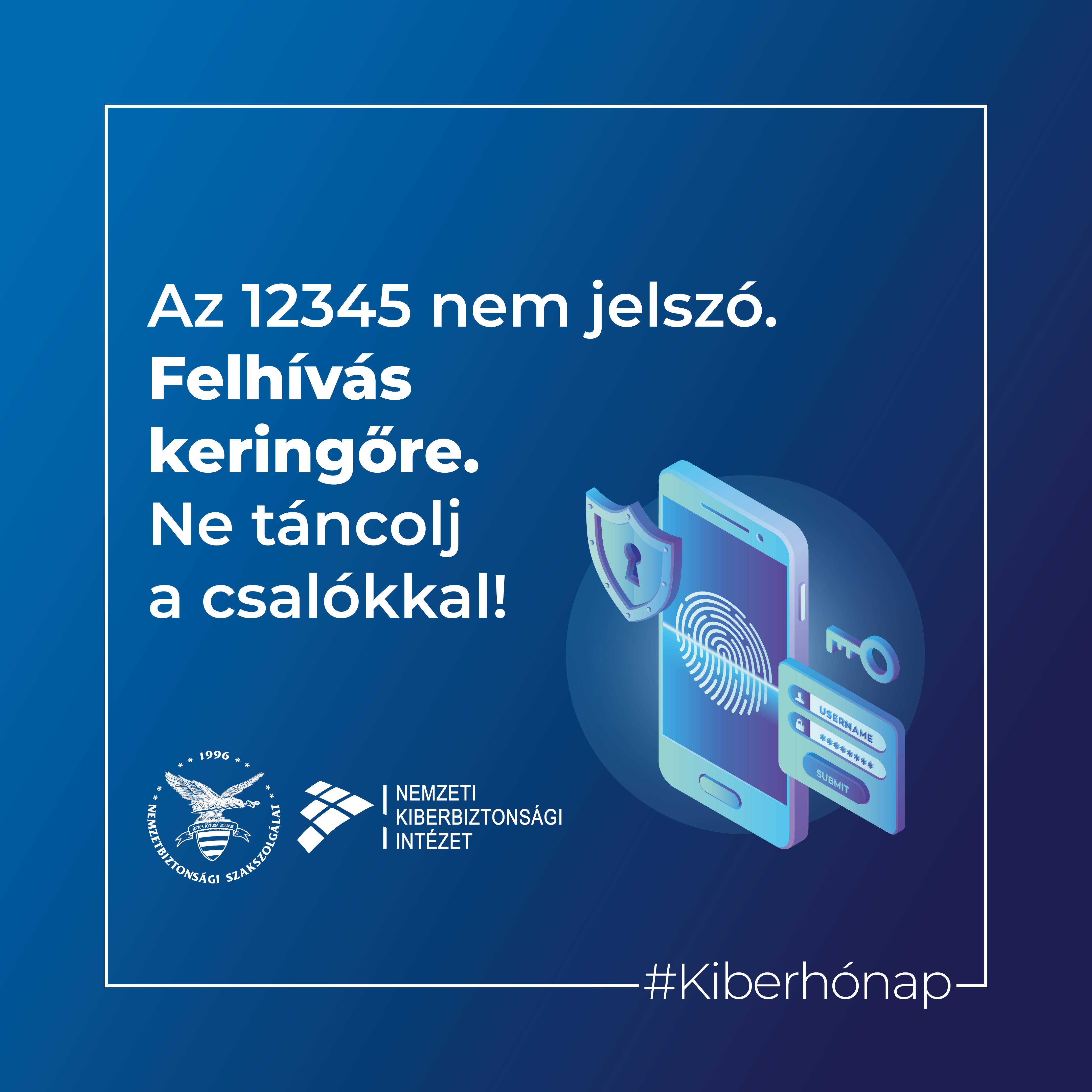 Mint minden év októberében, idén is a Nemzetbiztonsági Szakszolgálat Nemzeti Kibervédelmi Intézet szervezésében megvalósul az Európai Kiberbiztonsági Hónap (ECSM), amelynek kiemelt célja az edukáció, valamint a figyelemfelhívás a technikai eszközök biztonságos használatára, az online tér adatvédelmet, pénzügyi biztonságot veszélyeztető kockázataira, a felhasználói tudatosság elmélyítésére és a biztonsági alapismeretek fontosságára. Az 12345 nem jelszó. Felhívás keringőre. Ne táncolj a csalókkal!