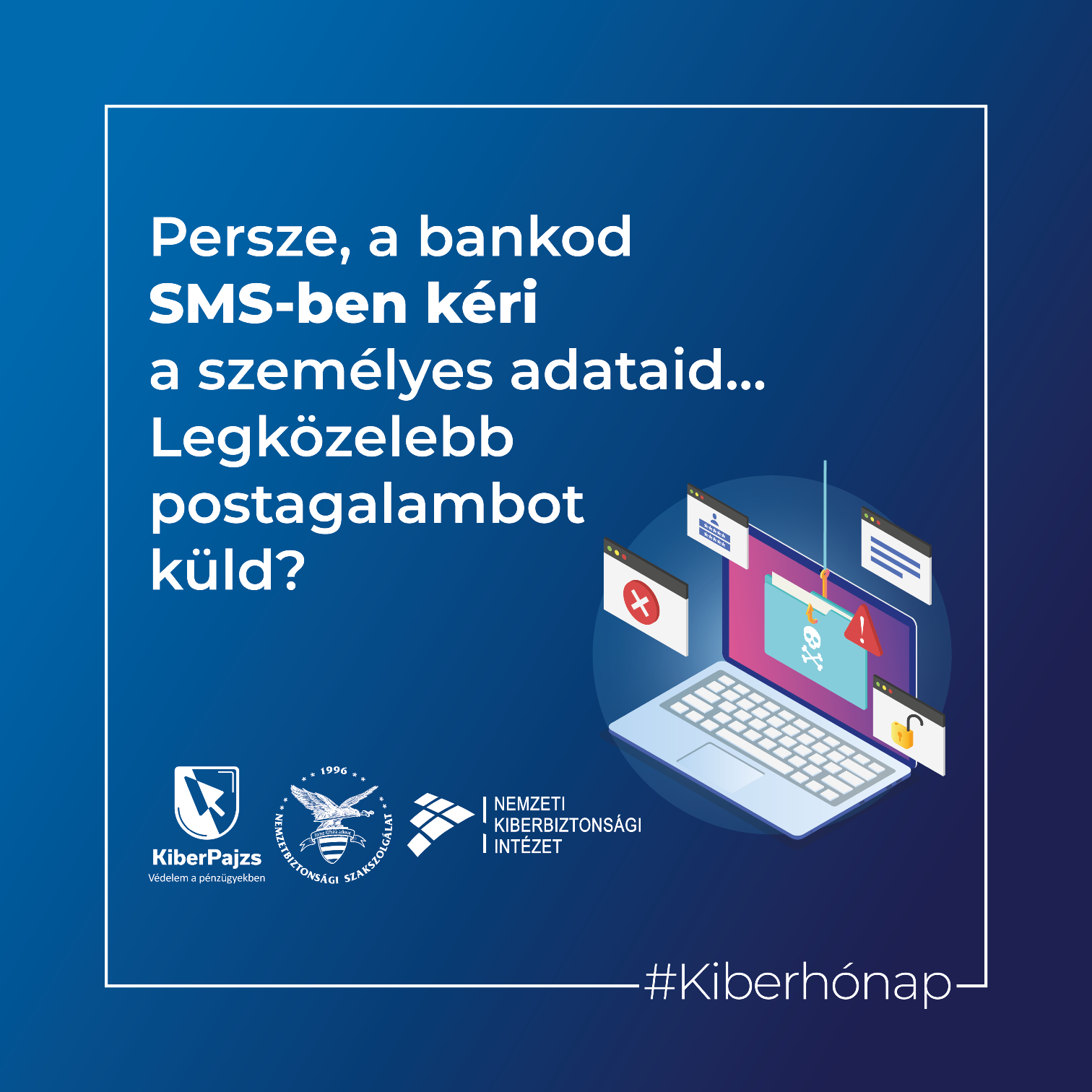 Mint minden év októberében, idén is a Nemzetbiztonsági Szakszolgálat Nemzeti Kibervédelmi Intézet szervezésében megvalósul az Európai Kiberbiztonsági Hónap (ECSM), amelynek kiemelt célja az edukáció, valamint a figyelemfelhívás a technikai eszközök biztonságos használatára, az online tér adatvédelmet, pénzügyi biztonságot veszélyeztető kockázataira, a felhasználói tudatosság elmélyítésére és a biztonsági alapismeretek fontosságára. Persze, a bankod SMS-ben kéri a személyes adataid... Legközelebb postagalambot küld?
