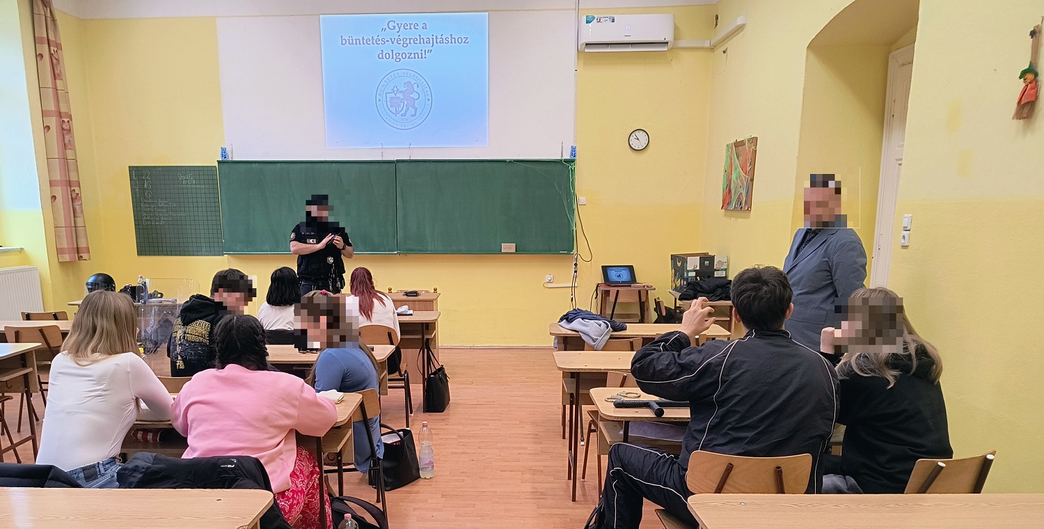 Az osztályfőnöki órán a diákok érdeklődve hallgatták a toborzók tájékoztatóját a büntetés-végrehajtási szervezet tevékenységéről, valamint a rendvédelmi életpálya lehetőségeiről. A műveleti főfelügyelő pedig bemutatta a rendszeresített kényszerítő eszközöket, amit a bátrabbak ki is próbálhattak.