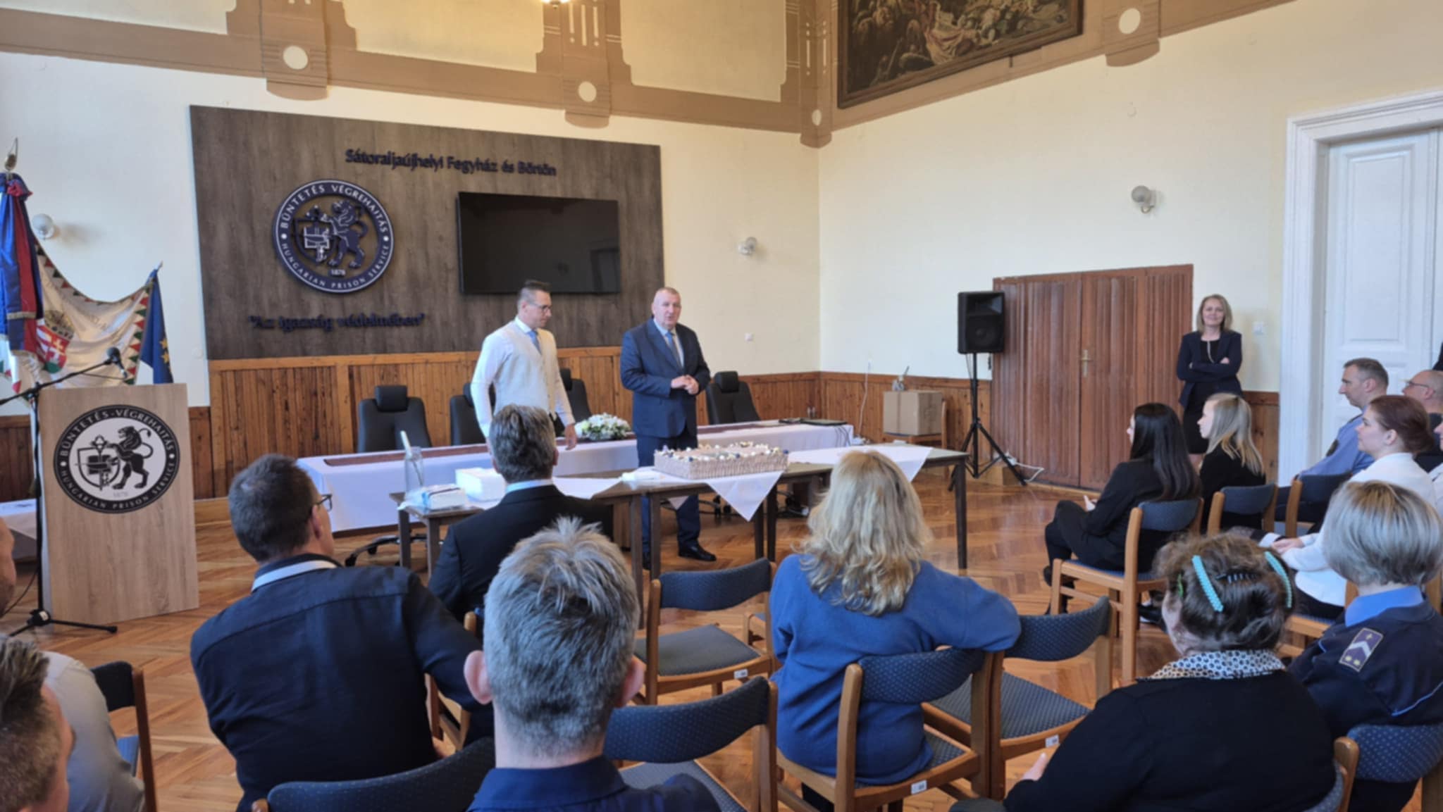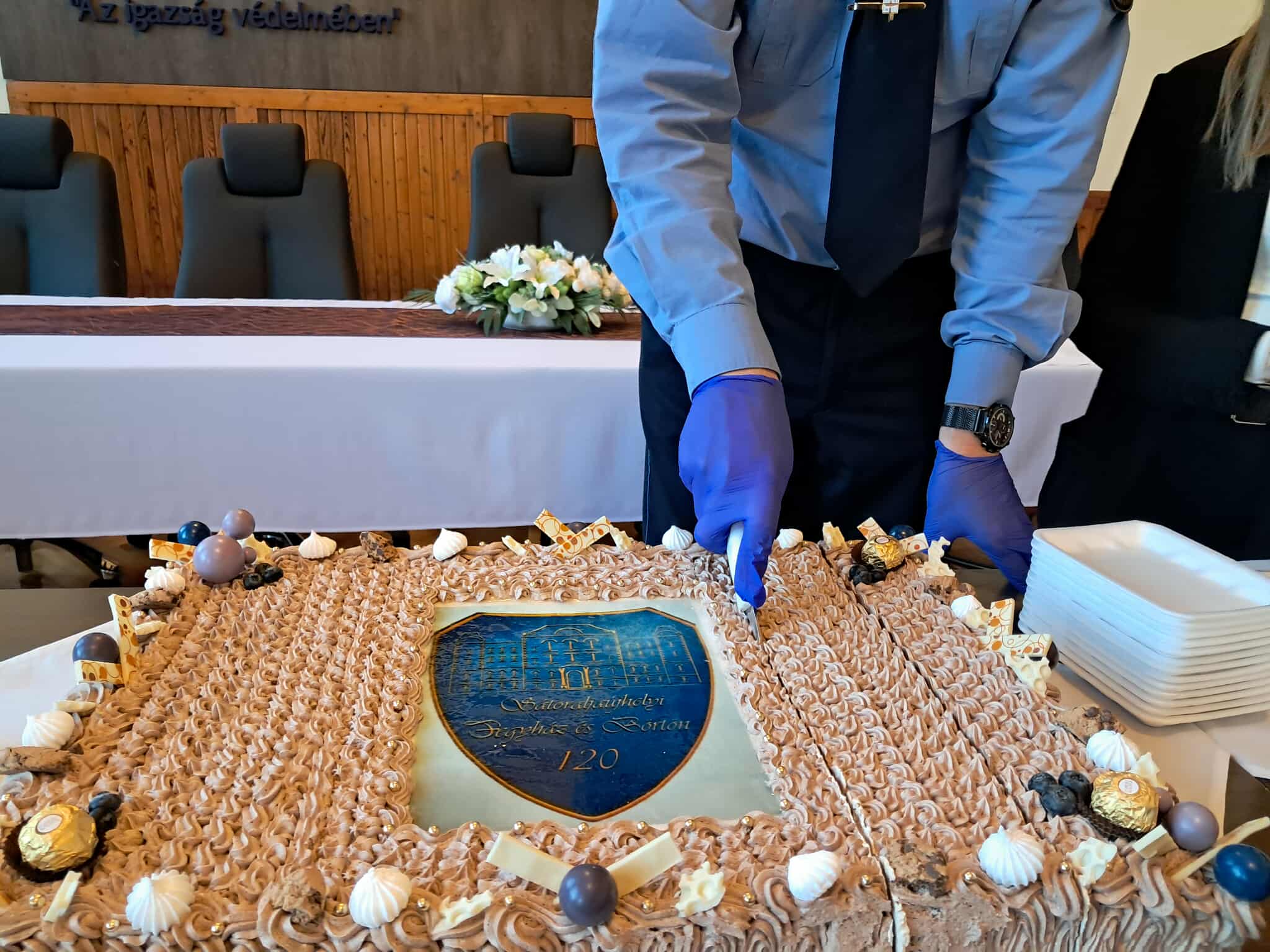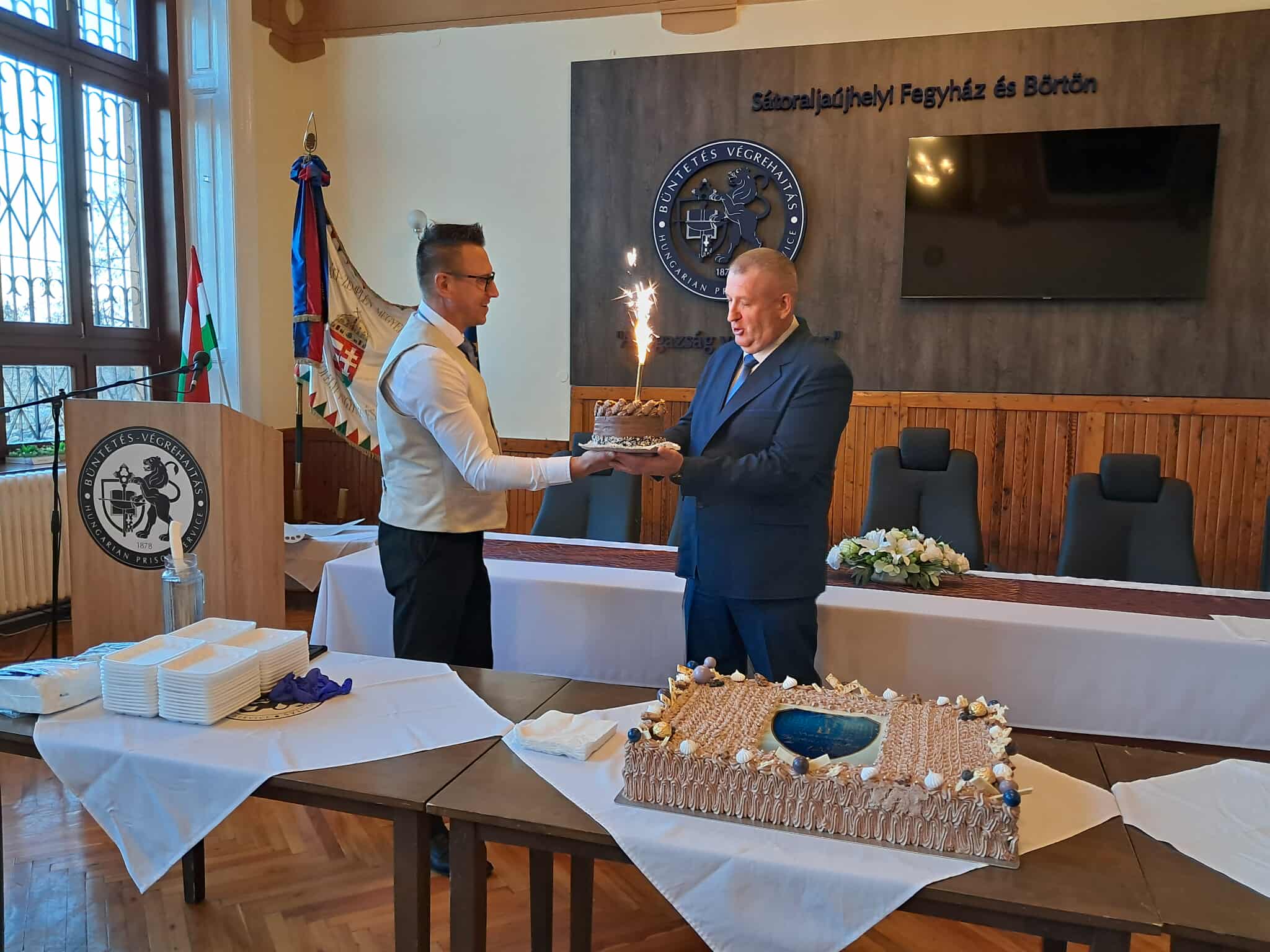 A sátoraljaújhelyi bv. intézet fennállásának 120. évfordulóján rendezett konferencia protokolláris rendezvényét követően a jelenlegi állománytagokat születésnapi tortával köszöntötte az intézet vezetése.
