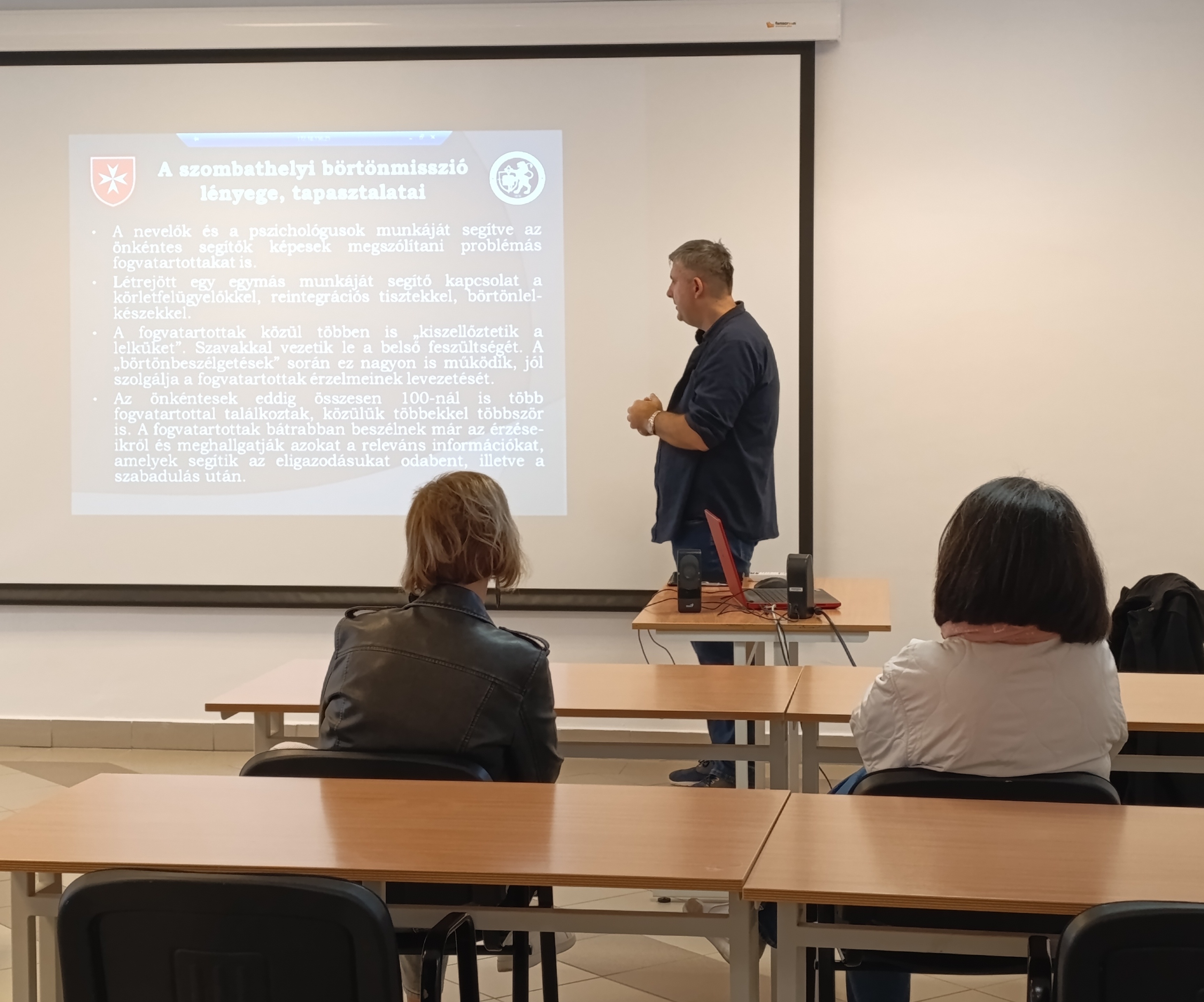 A szakmai nap intézetlátogatással kezdődött: a csoport tagjai a fogvatartotti épületek egyikében megnéztek egy zárkát, majd pártfogó felügyelő és reintegrációs tiszt munkatársaink tájékoztatták őket a szabadulásra felkészítés folyamatáról, a reintegrációs pogramokról és a pártfogó felügyelői munkáról. Az intézet kápolnájában a börtönlelkész a fogvatartás alatti vallásgyakorlás lehetőségeiről beszélt. A program az oktatóteremben folytatódott, ahol Szücs Péter önkéntes, koordinátor a Magyar Máltai Szeretetszolgálat Szombathelyi Csoportjának 2013 óta végzett börtönmissziós tevékenységéről tartott előadást.