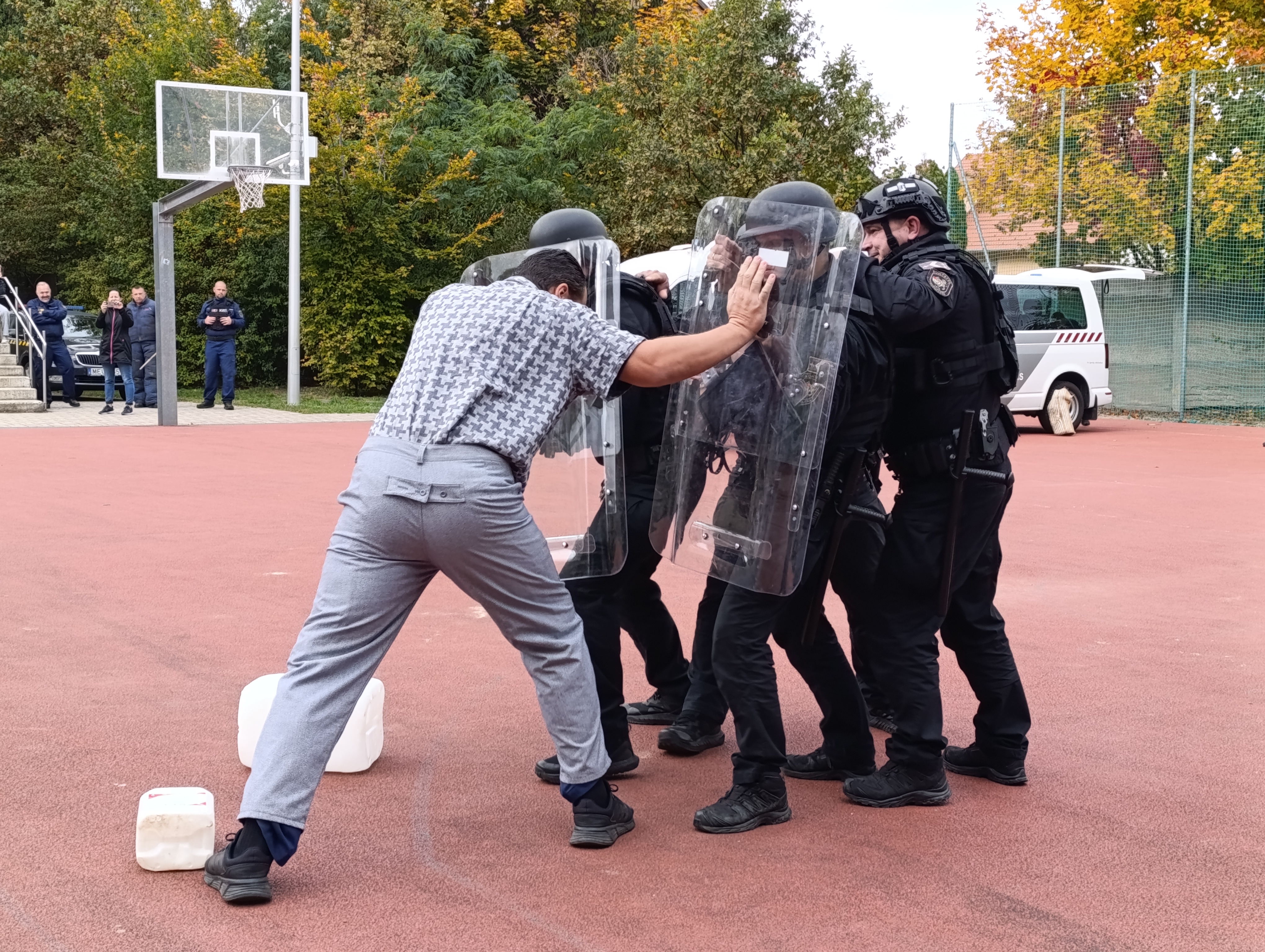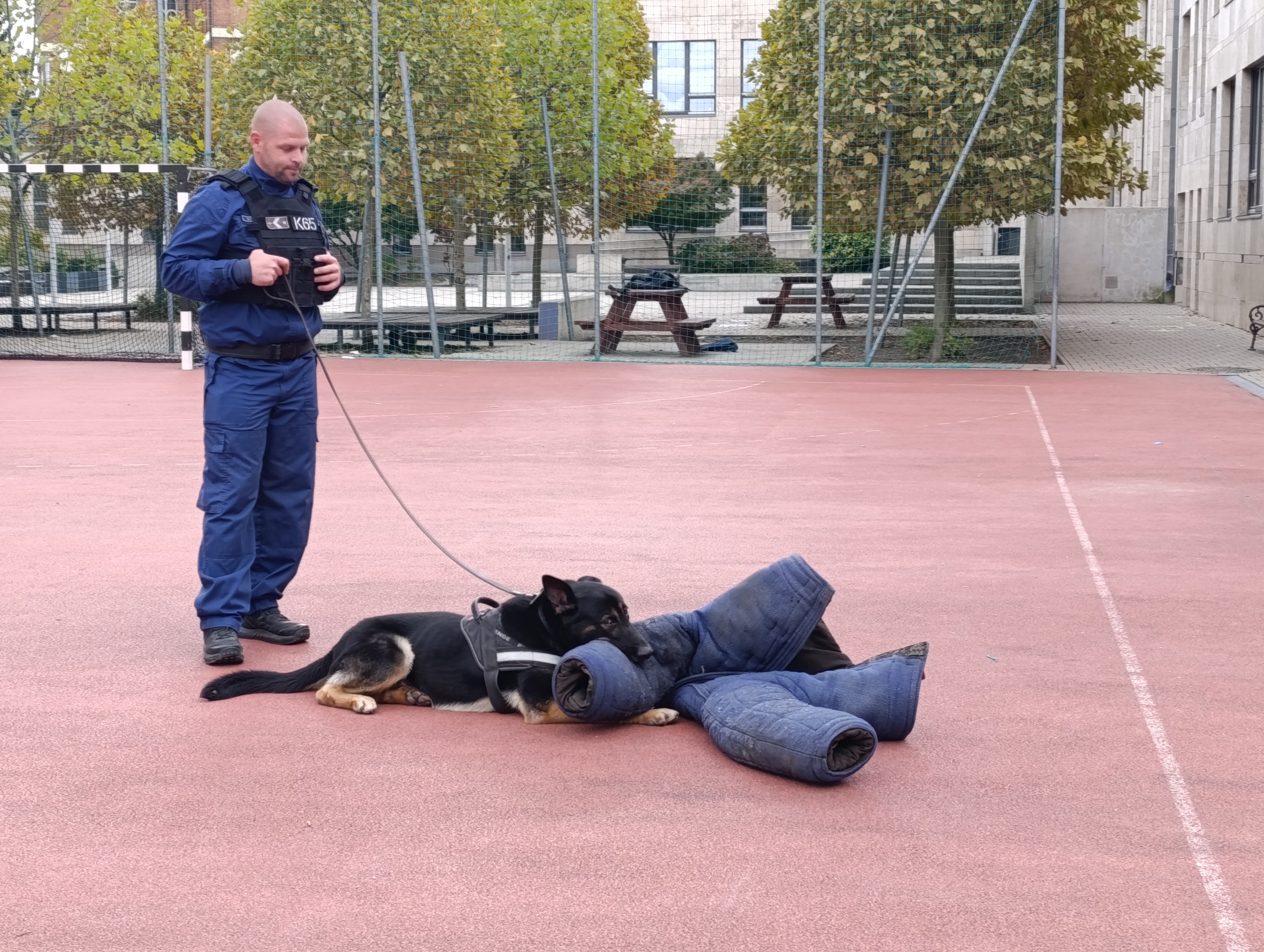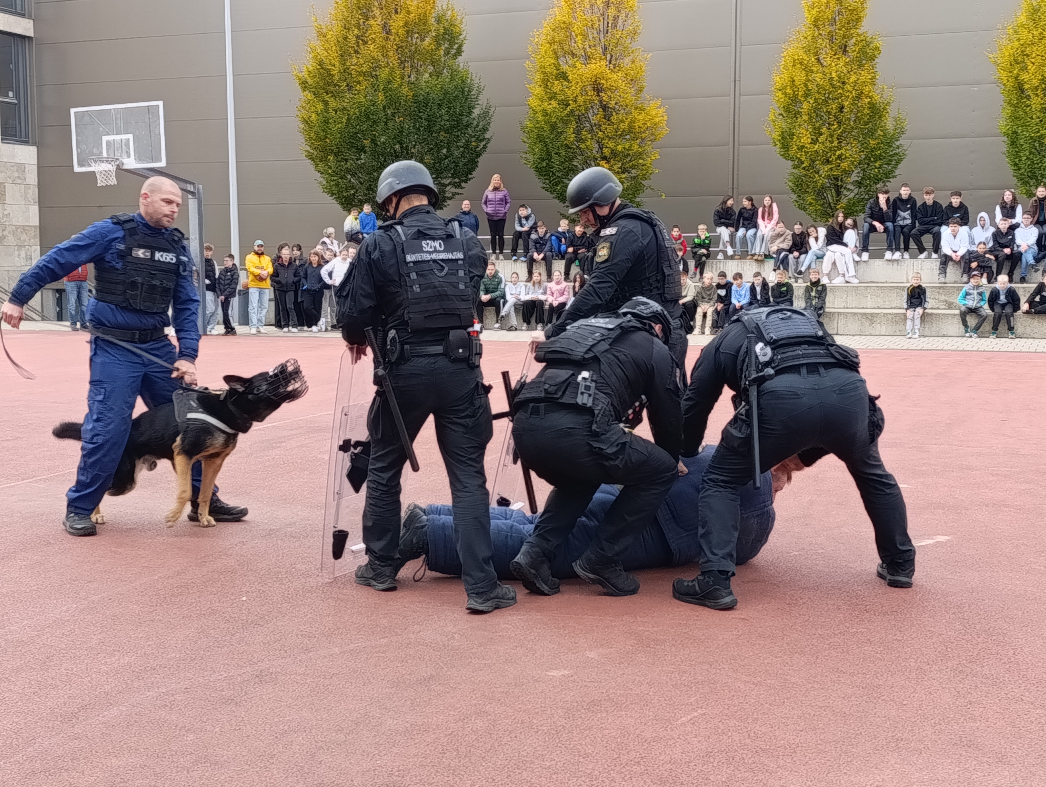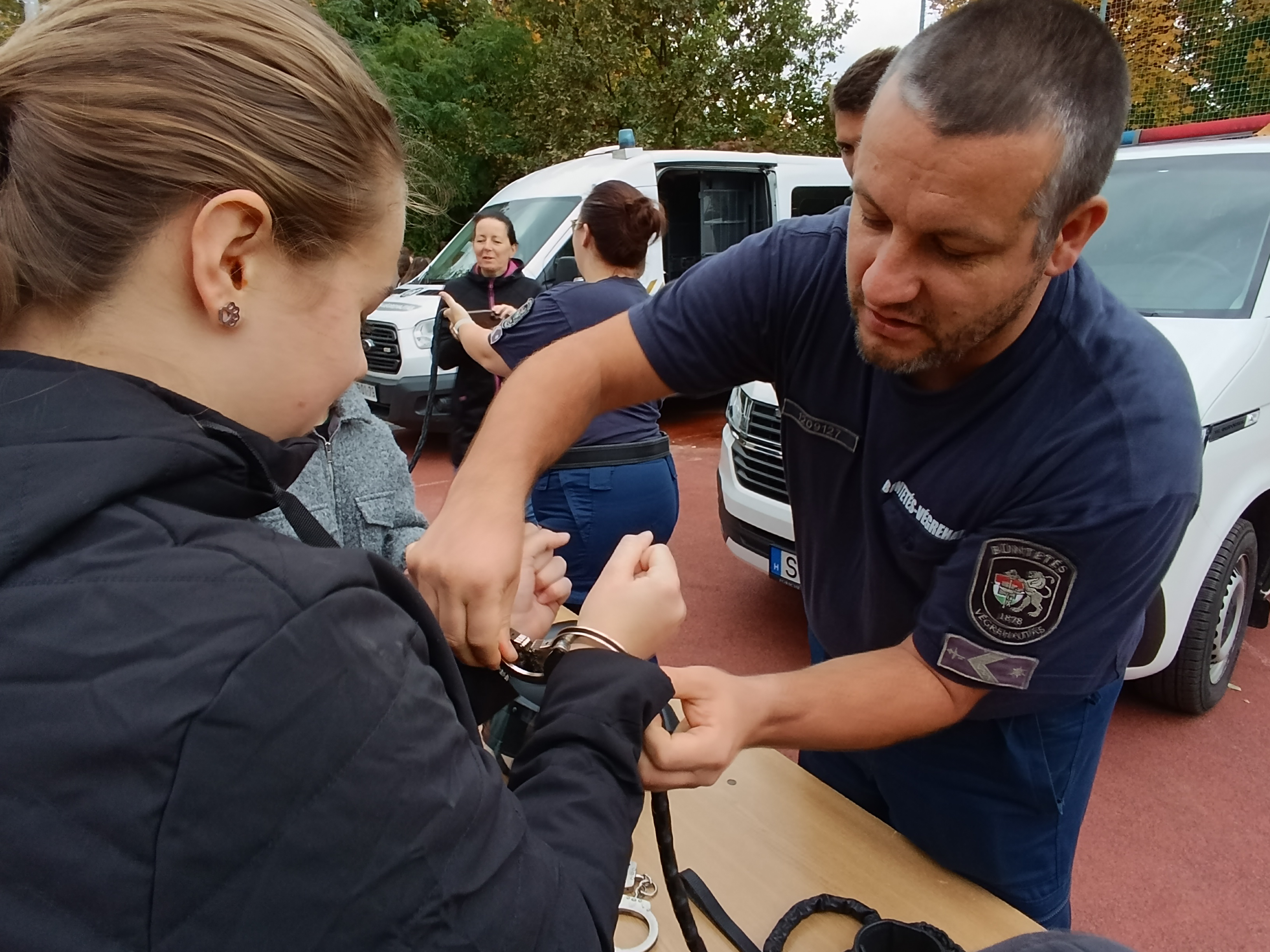 Az I. Agglomeráció toborzó csoportjának tagjai rabszállító autóval érkeztek az iskola sportpályájára: a diákok kívülről és belülről is alaposan szemügyre vehették a szállító járművet. A közszemlére tett mozgáskorlátozó eszközöket – kéz- és lábbilincseket, vezetőszárat – is sokan kipróbálták. Közben az intézet kutyatelepéről is megérkeztek a „vendégek: Argo, a kábítószer-kereső kutya a gyerekek által összekevert kartondobozok egyikébe rejtett (természetesen ártalmatlan) zsákmányra vadászott, Conor pedig a Műveleti Osztály munkatársainak segítségével két ellenszegülő fogvatartottnak öltözött kollégánk elfogásában jeleskedett. Néhány bátor jelentkező a szolgálati kutyák kiképzéshez használt védőfelszerelést, a „csibészkart” magára öltve Conor erejét is megtapasztalhatta.