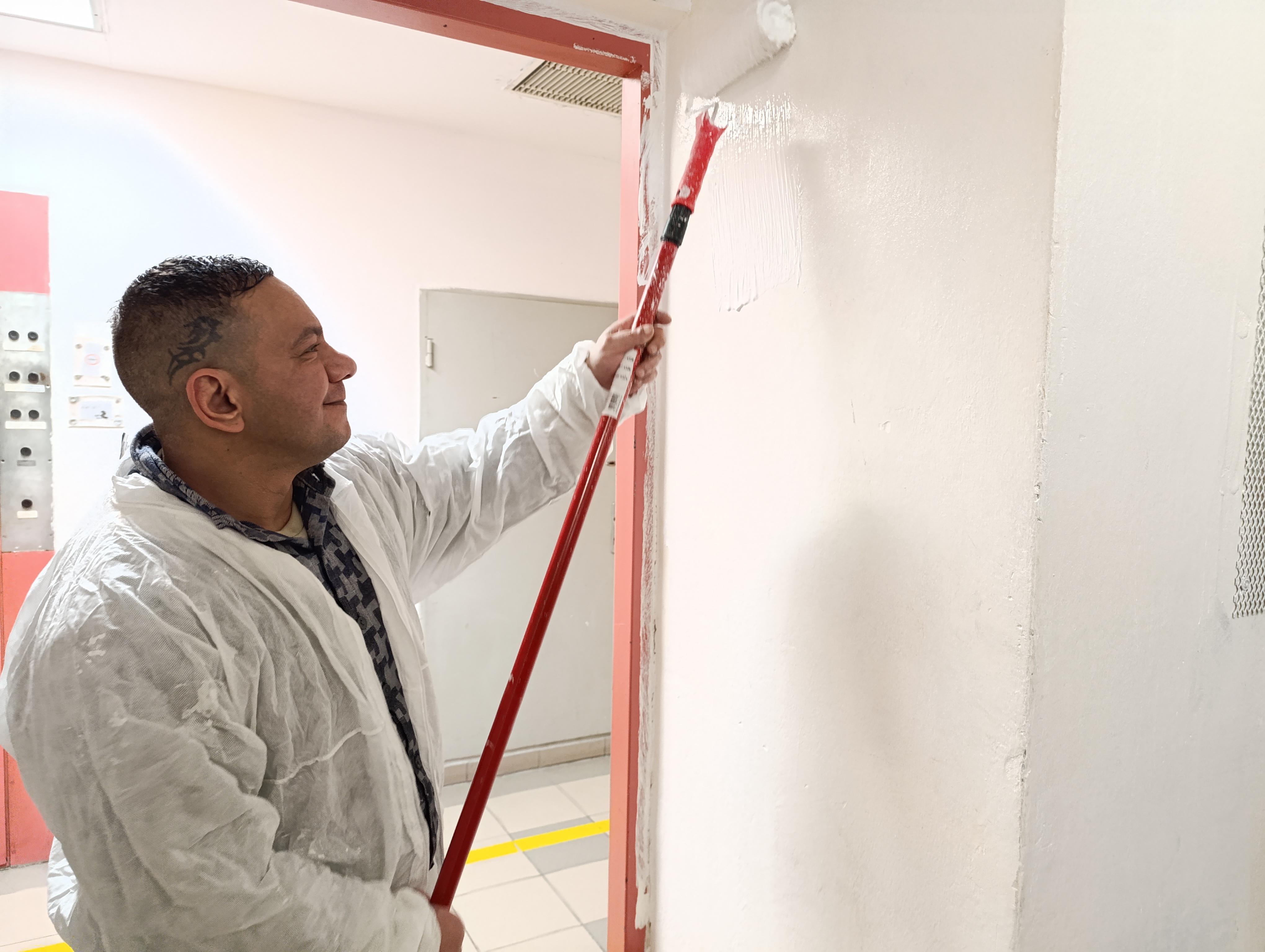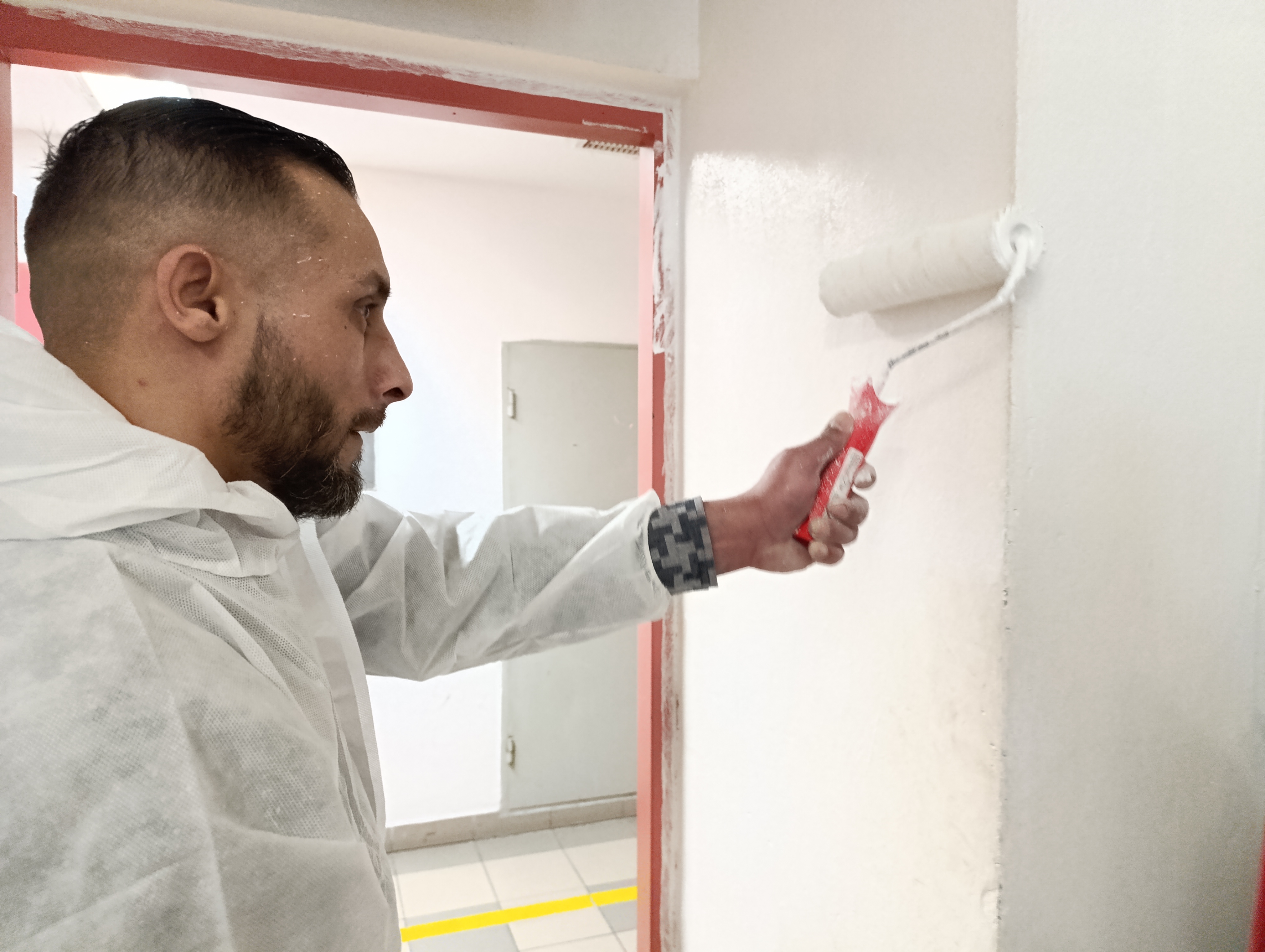 Horváth Tibor szakoktatótól megtudtuk: a festő-mázoló-tapétázó képzésben részt vevők csütörtökönként és péntekenként alkalmazzák a szakma elméletben már elsajátított fogásait. Ottjártunkkor két kiürített zárkában dolgoztak: a glettelést követően tisztasági festést végeztek. A leendő szakmunkások az elkövetkezendő hetekben a tapétázás folyamatát gyakorolják, majd a májusi – remélhetőleg sikeres – záróvizsgát követően szakmai bizonyítványt kapnak.