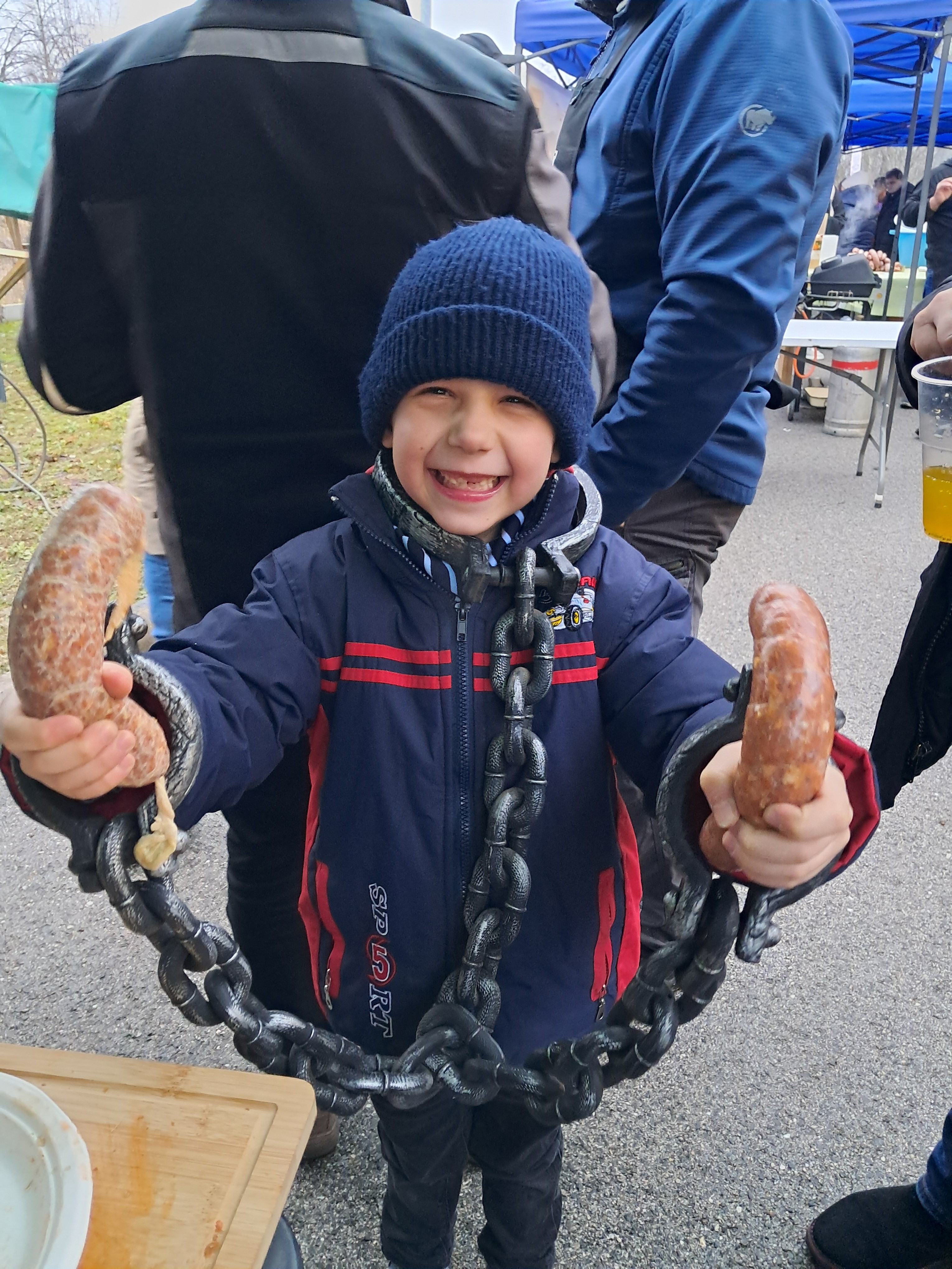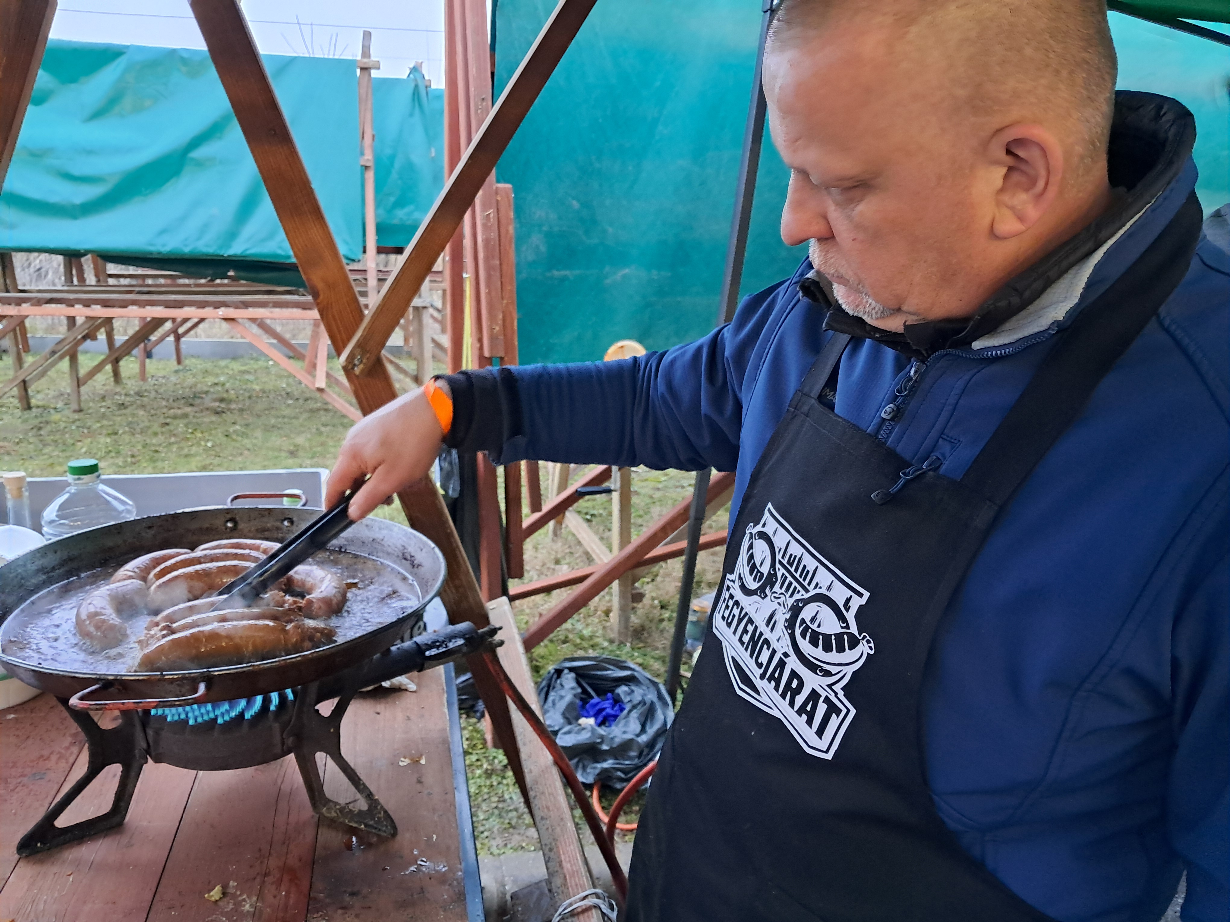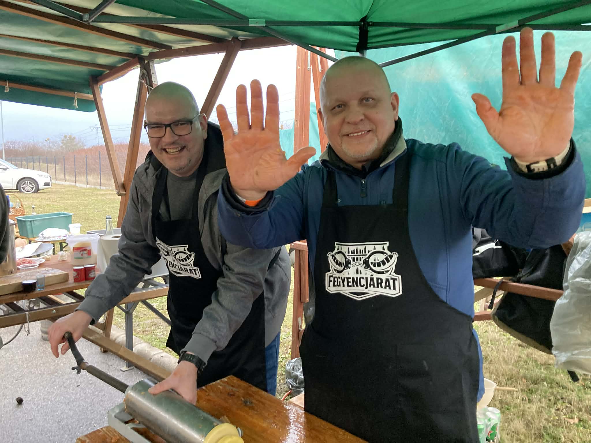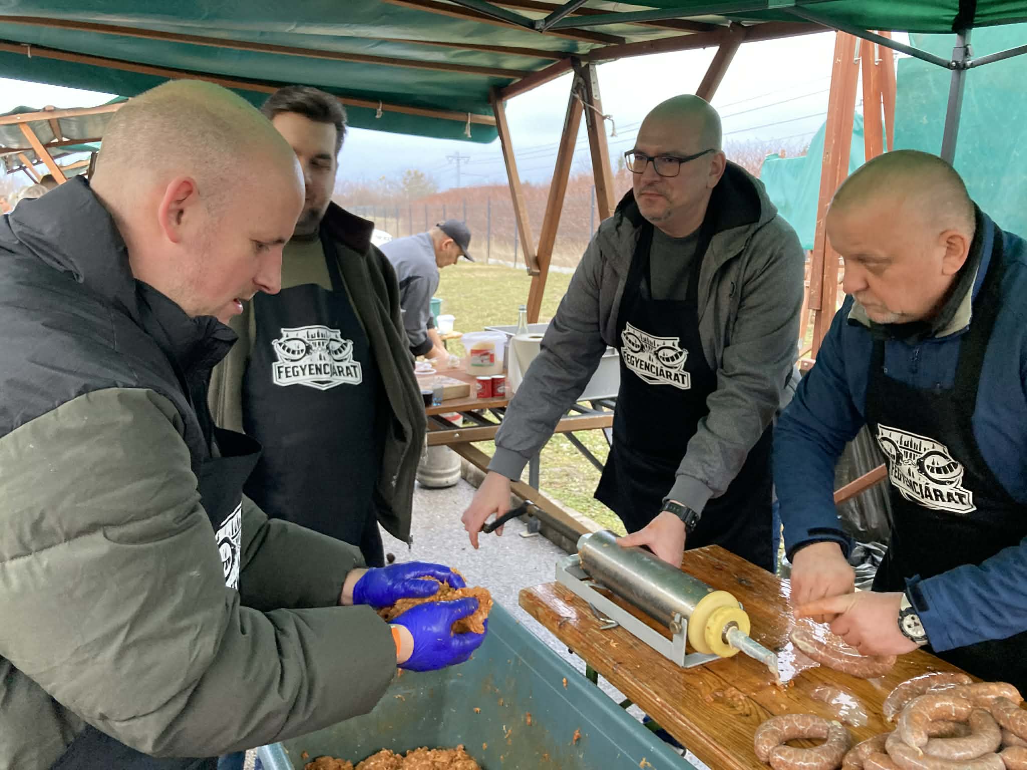 A fesztivál versenyszámai közül a helyszínen töltött kolbász és a kötényverseny résztvevői voltak kollégáink, akik egy almás-mézes pároltkáposztával töltött kolbászhoz darálták, fűszerezték, gyúrták, majd töltötték bélbe a húsokat. Az ízt, illatot, állagot, megjelenést és a kreativitást bíráló zsűri elé kerülő, „lebilincselő módon tálalt” mintadarabokon kívül rögtön meg is kóstolhatók voltak a Fegyencjárat sátránál a frissen elkészült és kisütött különleges kolbászok, amelyekért megérdemelten vehette át a csapat a zsűri elismerő oklevelét a kolbász parti végén.