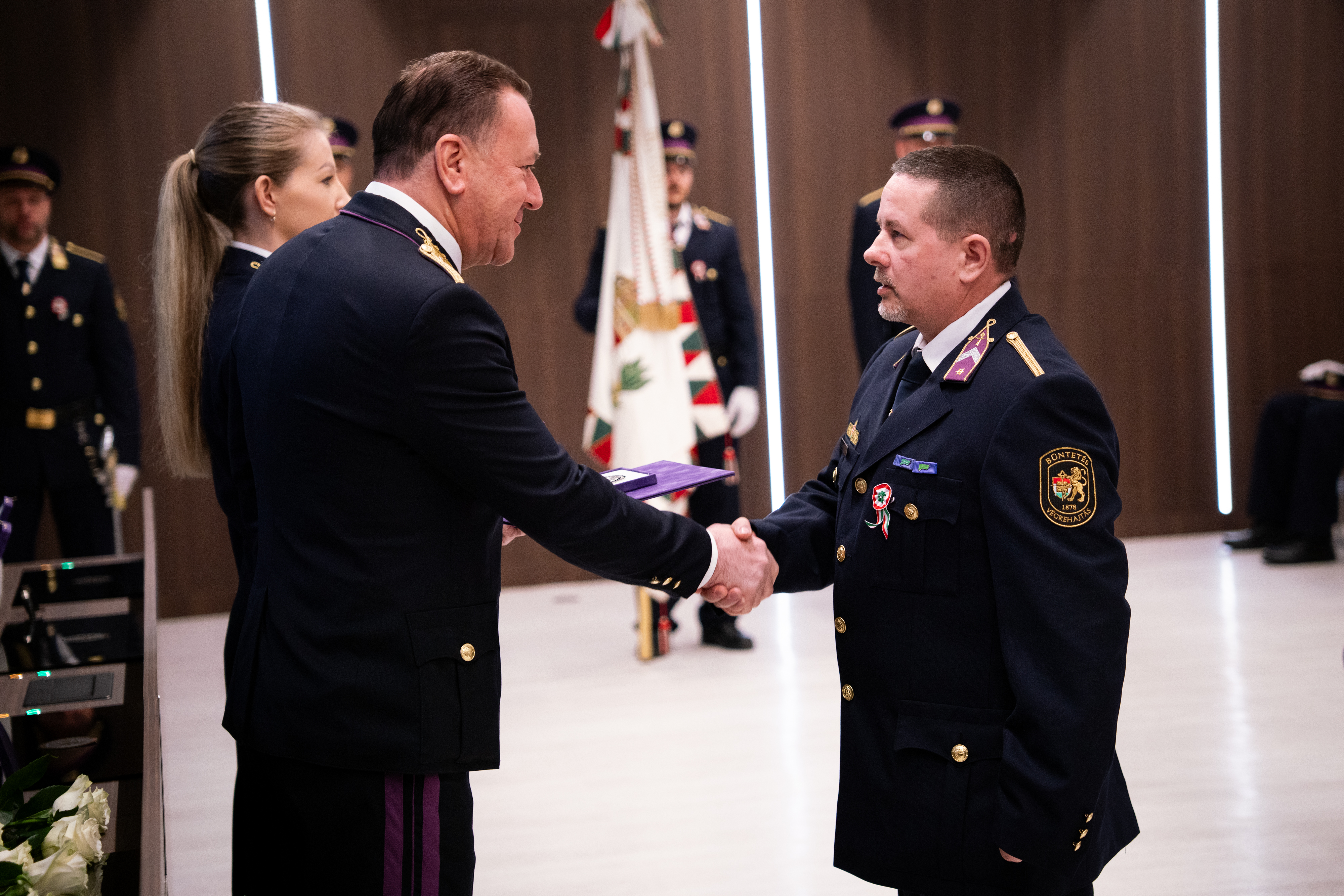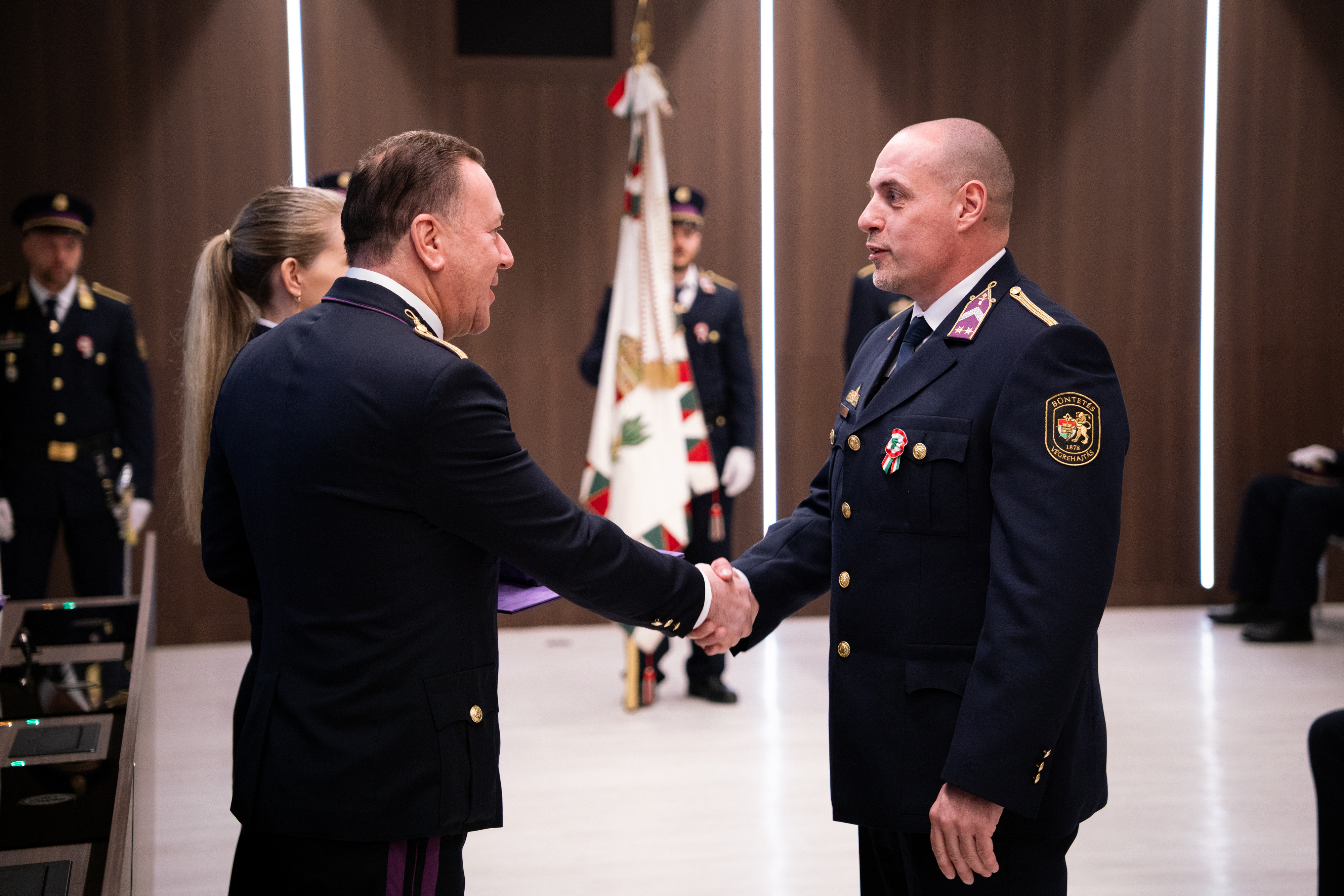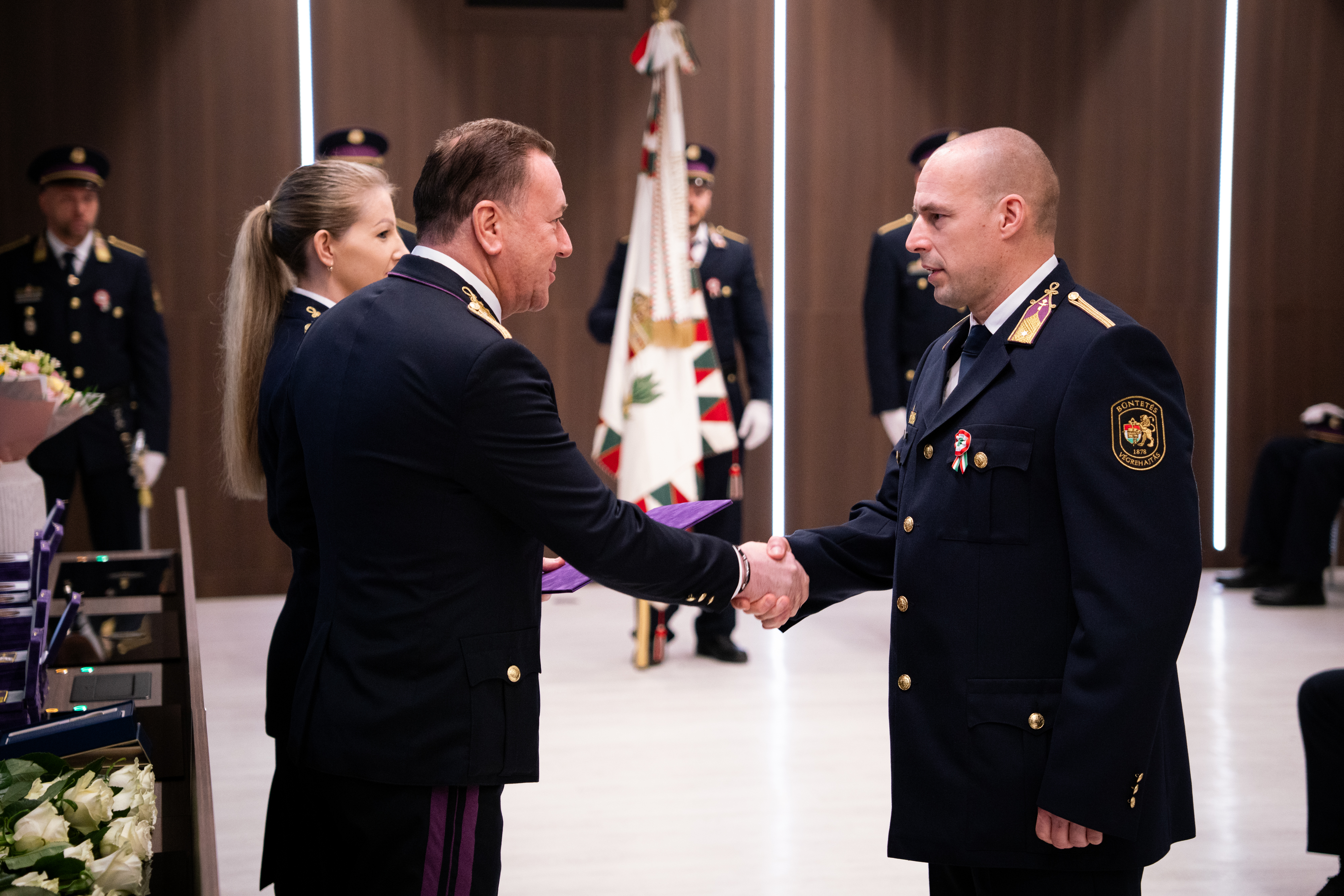 Porubszky Szabolcs bv. ezredes, parancsnok köszönetét és köszöntő szavait tolmácsolva Csalló Norbert bv. alezredes, parancsnokhelyettes adta át az elismeréseket. Az I. Agglomerációs Központ parancsnoka a nemzeti ünnep alkalmából kiemelkedő szolgálati tevékenysége alapján pénzjutalomban részesítette Galuszek Imre bv. őrnagyot és Élő Gyula bv. törzszászlóst.